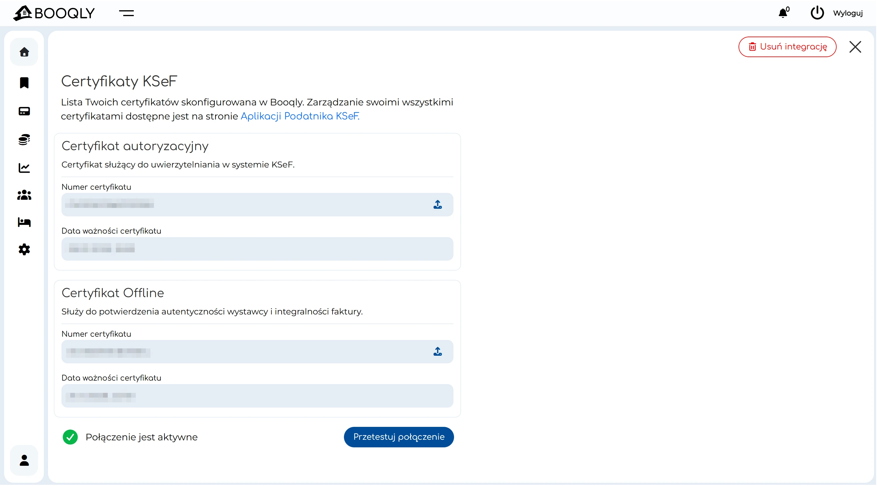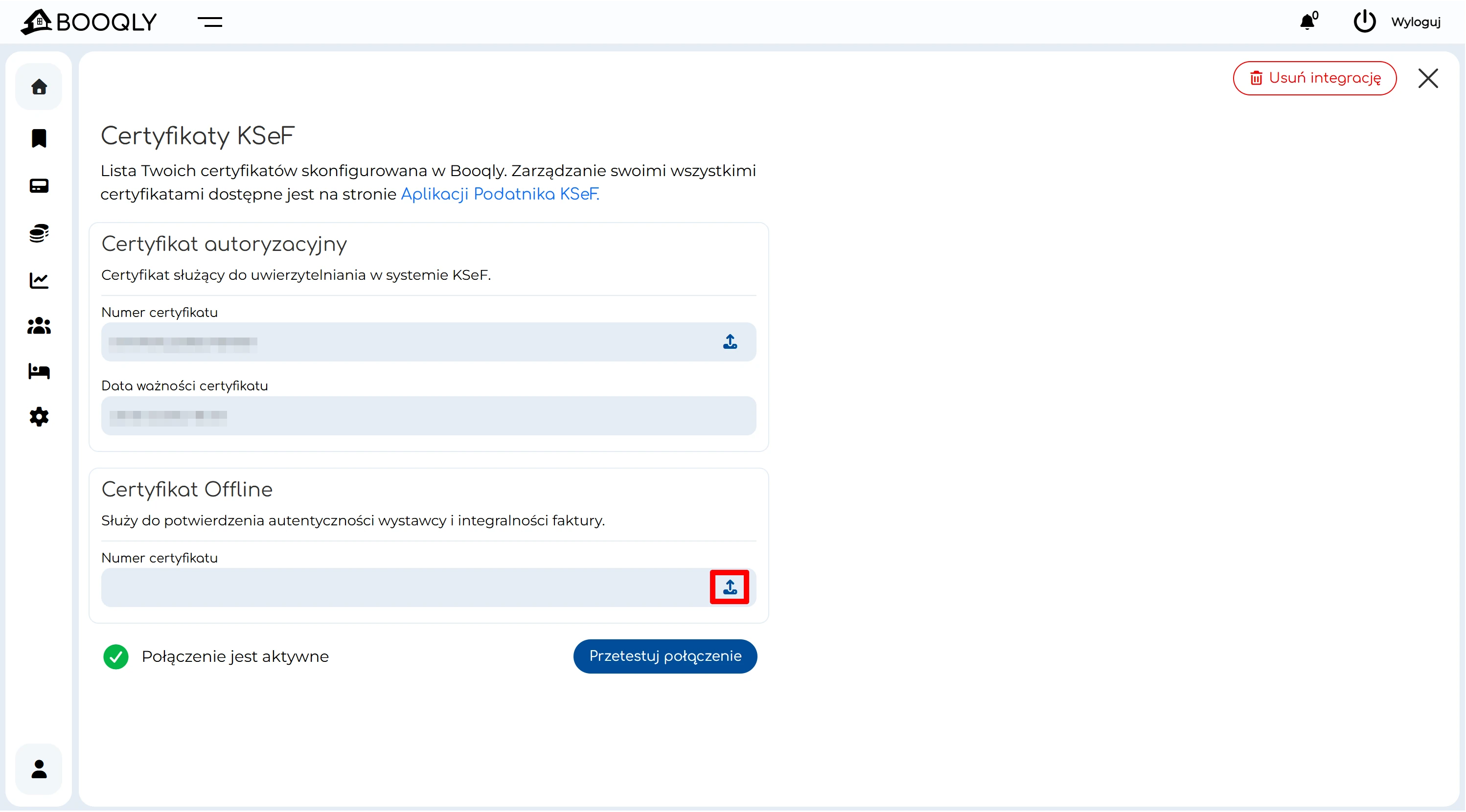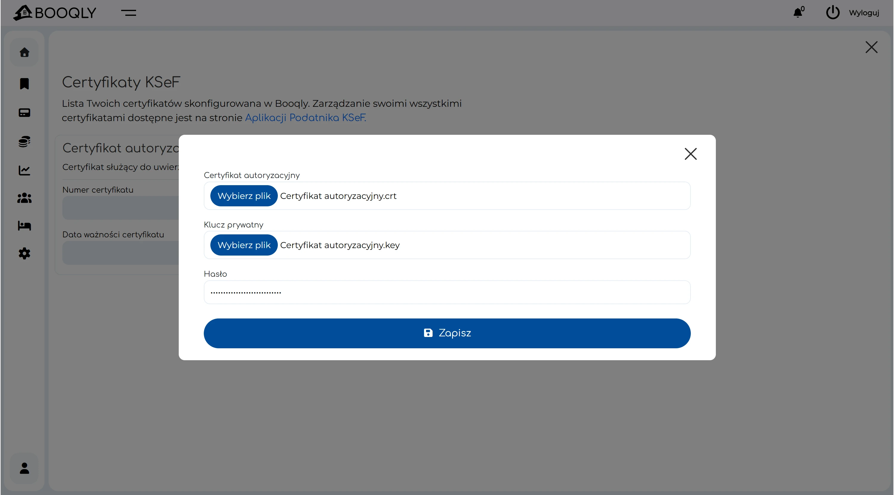 Krok 3: dodanie certyfikatów KSeF w Booqly (Finanse → Integracja z KSeF)