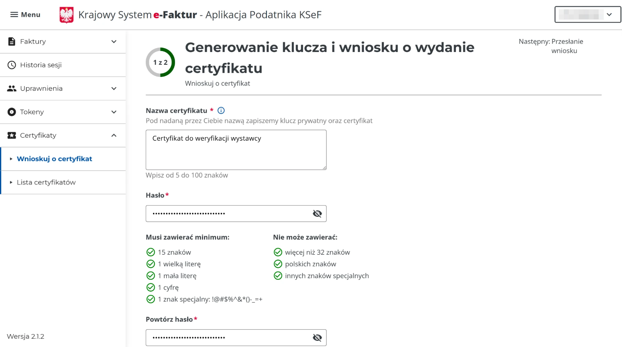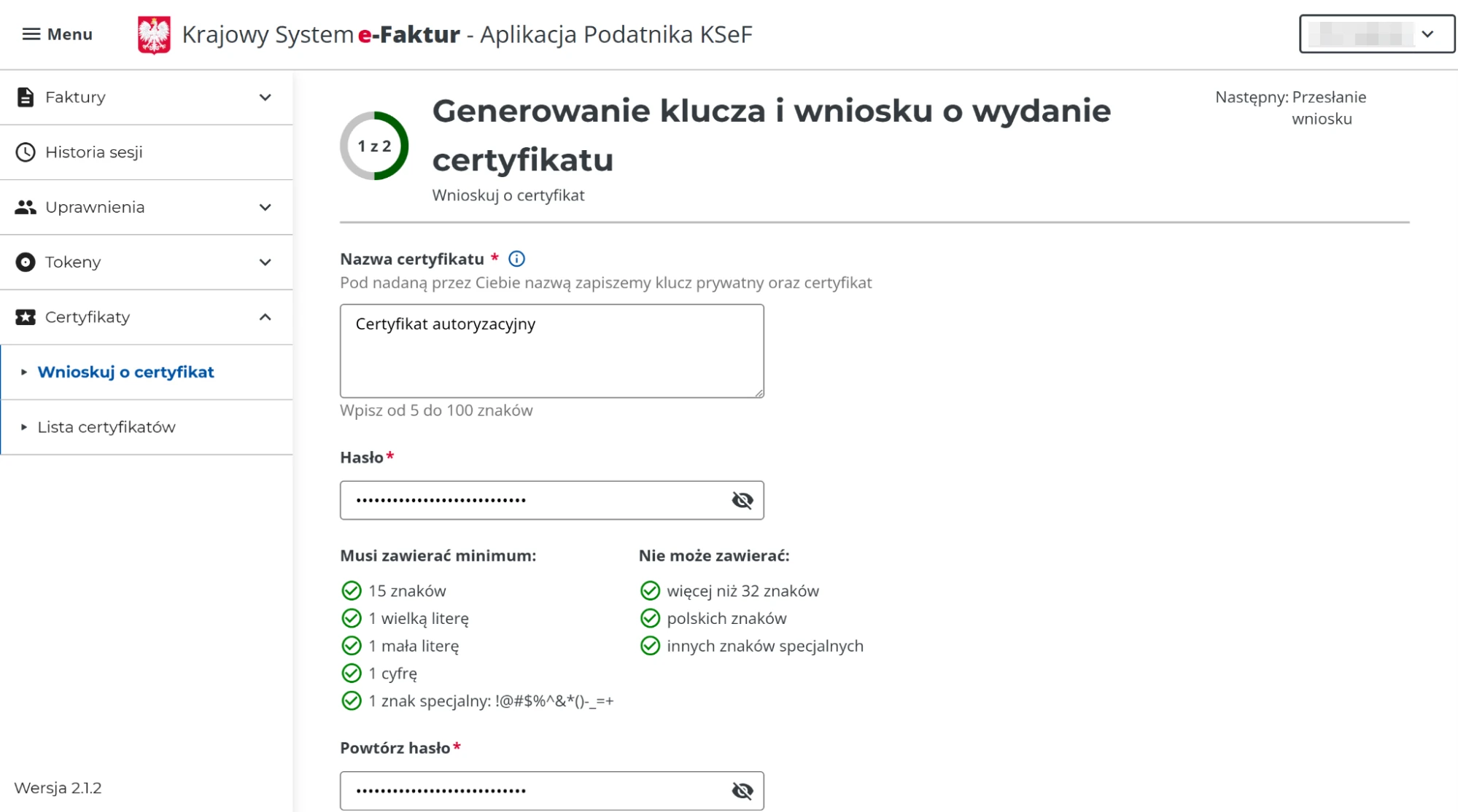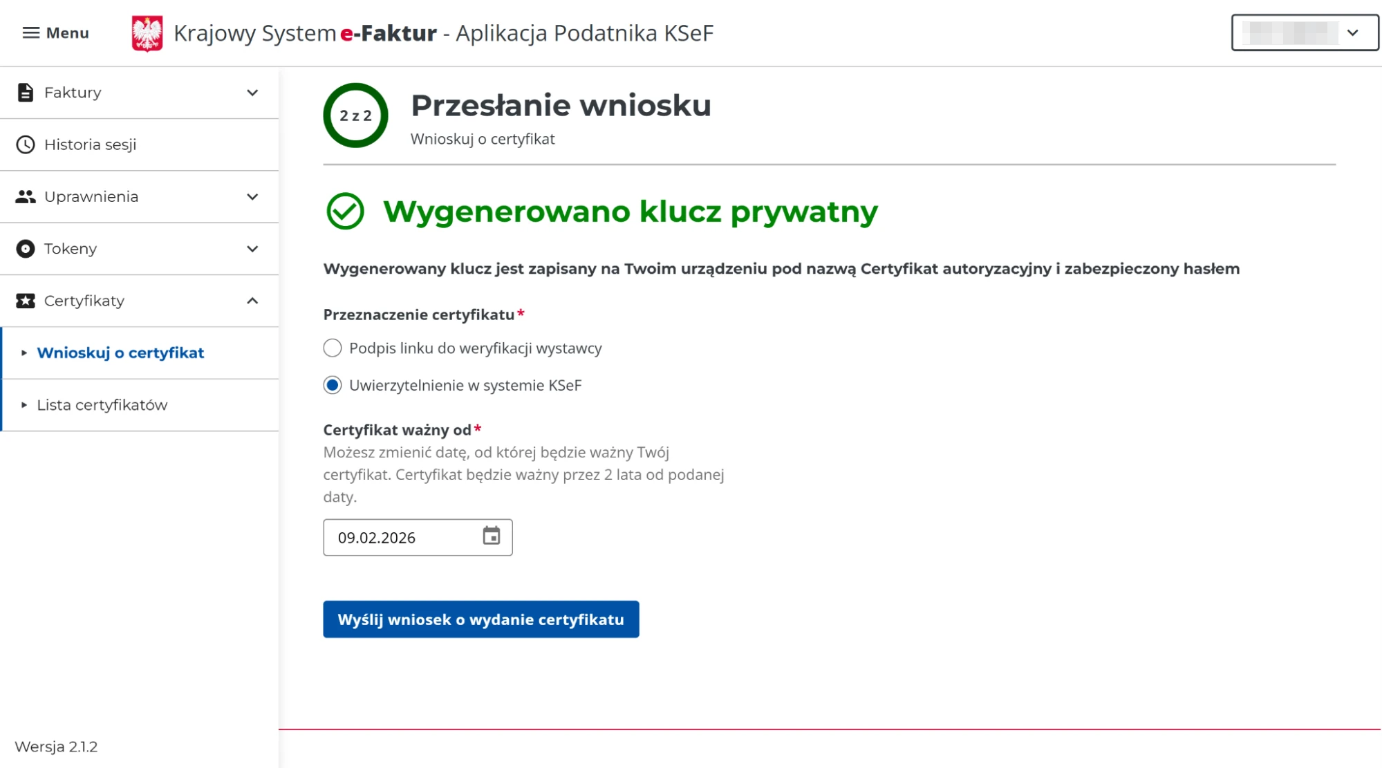 - Wygenerowanie 2 certyfikatów w KSeF: