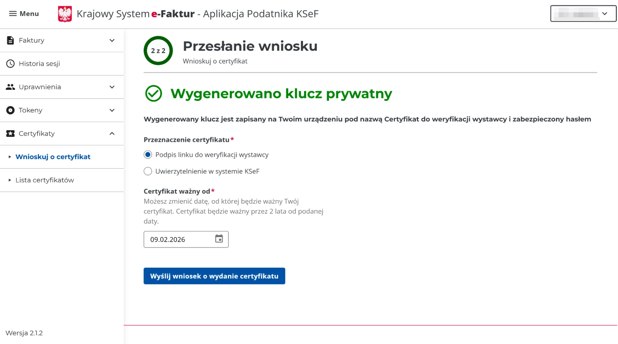 - Przejdź do: Certyfikaty > Wnioskuj o certyfikat.